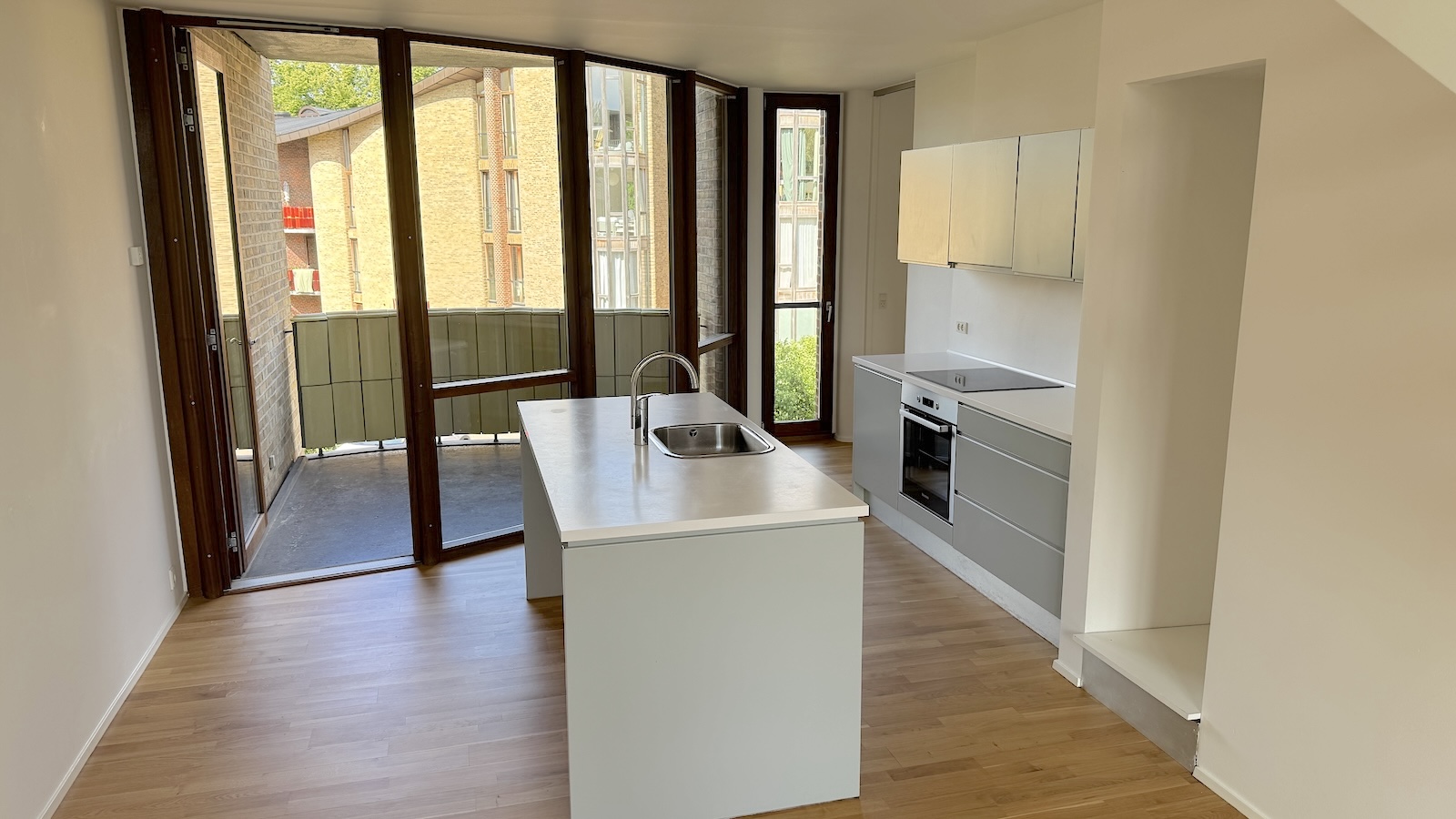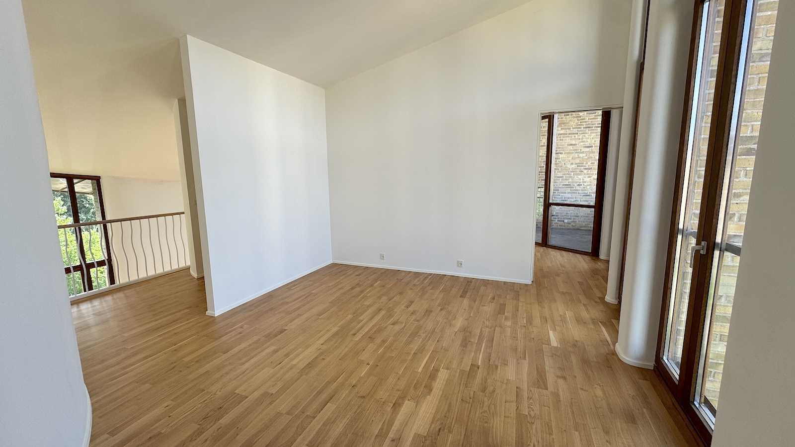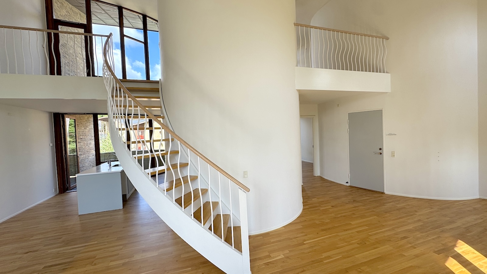 I de rolige og grønne områder nær Bispebjerg Hospital, findes denne helt unikke lejlighed på øverste etage. Lejligheden består af to plan. Nederste plan består af et et stort åbent rum med stue og køkken i åben forbindelse. To hyggelige altaner samt to soveværelser og badeværelse med bruseniche og vaskemaskine/tørretumbler. Øverste plan består af et åbent stueafsnit, endnu en altan, et soveværelse samt badeværelse med bruseniche. Ejendommen har en unik arkitektur og er beliggende i et roligt grønt område. Kort afstand til offentlig transport.
