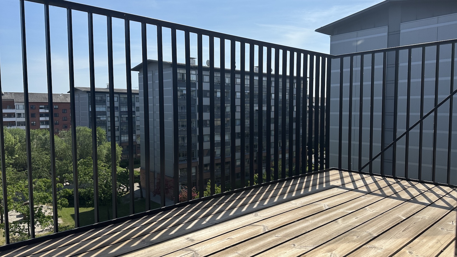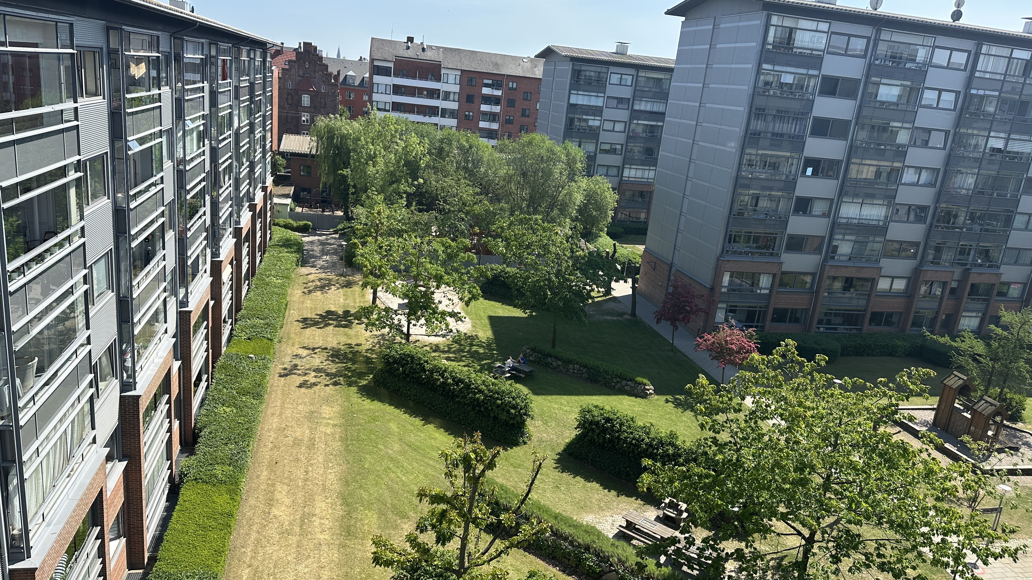 Lejligheden er beliggende på 5. sal og består af en entre, hvorfra man til den ene side kan gå til de to soveværelser. Videre frem er der et badeværelse med toilet, bruseniche samt vaskemaskine/tørretumbler. Via en mellemgang kommer man ind til lejlighedens rummelige køkken og stue, der er i åben forbindelse. Herfra er der udgang til en dejlig Sydøst vendt terrasse. Udover adgang til et hyggeligt gårdmiljø er der fælles tagterrasser med smuk udsigt over byen. Der er elevator i bygningen, parkering og cykelparkering i kælderen samt mulighed for at leje en personlig p-plads. Privat depotrum. Der er Fitness center og cafe i ejendommen, der beliggende i kort afstand til alt det bedste Frederiksberg har at tilbyde af cafeer, restauranter og shopping. Ligeledes kort afstand til flere Metro stationer
